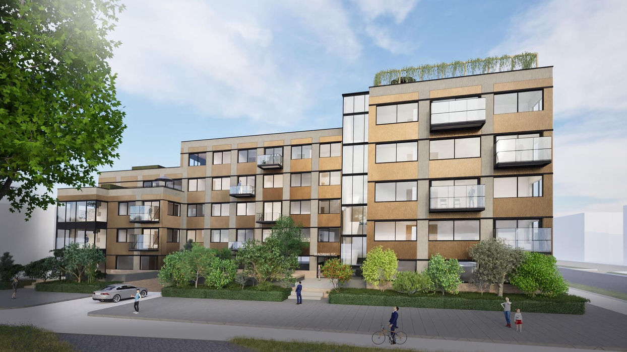 We’re constructing 64 residential units, 1.100 m2 ground floor office, a bike and car parking facility, shared roof space, wash facilities.